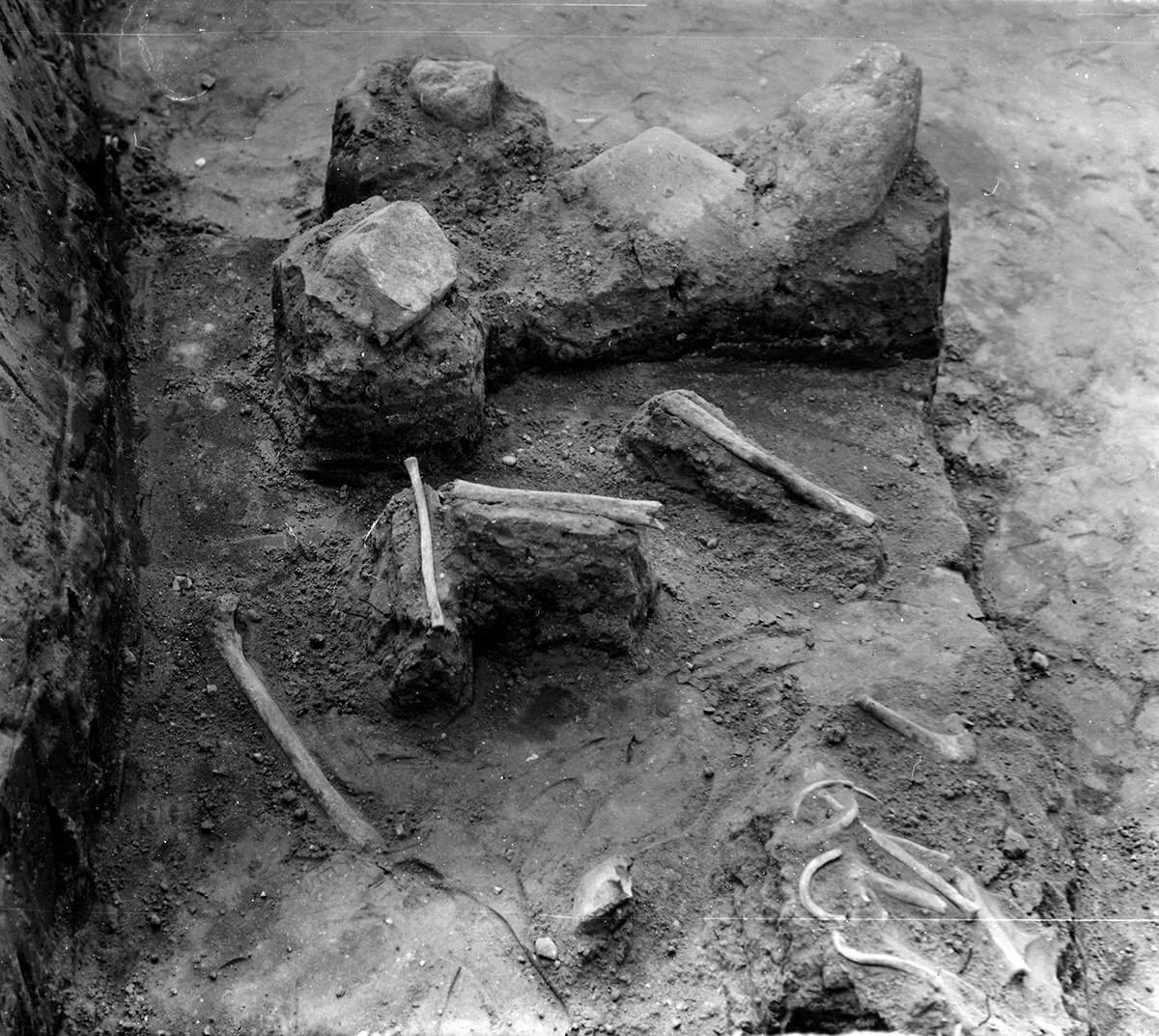 0,35 m gylyje nuo žemės paviršiaus, kv. H-1,2, K-1,2, atsidengė visiškai suardytas kapas. Rasti pavieniai šonkauliai bei kai kurie rankų kaulai. Nei palaidojimo krypties, nei mirusiojo padėties kape nustatyti nebuvo galima. Radinių ir organinės medžiagos liekanų nerasta.
